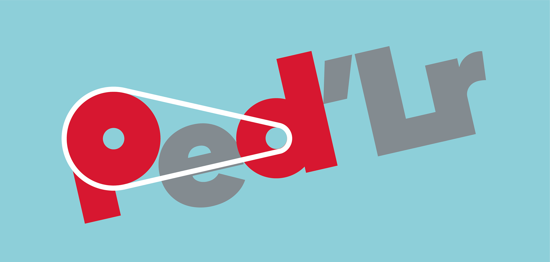 The cart is attached to a tricycle, so the 'P' and 'd' of the logo mimic the drive train and chain of a bicycle.
